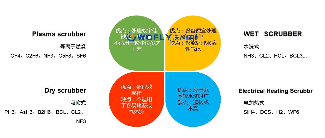 由于以上四種氣體對環(huán)境或人體皆具有一定的危害性,必須防止其直接排放大氣中,所以,一般半導體廠都以加裝大型中央廢氣處理系統(tǒng).但此系統(tǒng)僅以水洗滌廢氣.故其應用范圍僅限于處理水溶性氣體,無法因應日新月異且分工細微的半導體工藝廢氣.因此必須依據(jù)各工藝所衍生出的氣體特性種類,選擇搭配相對應的廢氣處理設備,才能有效解決廢氣問題.而由于工作區(qū)域多半離中央廢氣處理系統(tǒng)前,常因氣體特性導致管路中結(jié)晶或粉塵堆積,造成管路堵塞后導致氣體泄漏,嚴重者甚至引起爆炸,無法確保現(xiàn)場工作人員之工作安全.因此在工作區(qū)域需配置適合工藝氣體特性的小型廢氣處理設備(Local Scrubber),以減少在工作區(qū)域滯留的廢氣,確保人員安全。