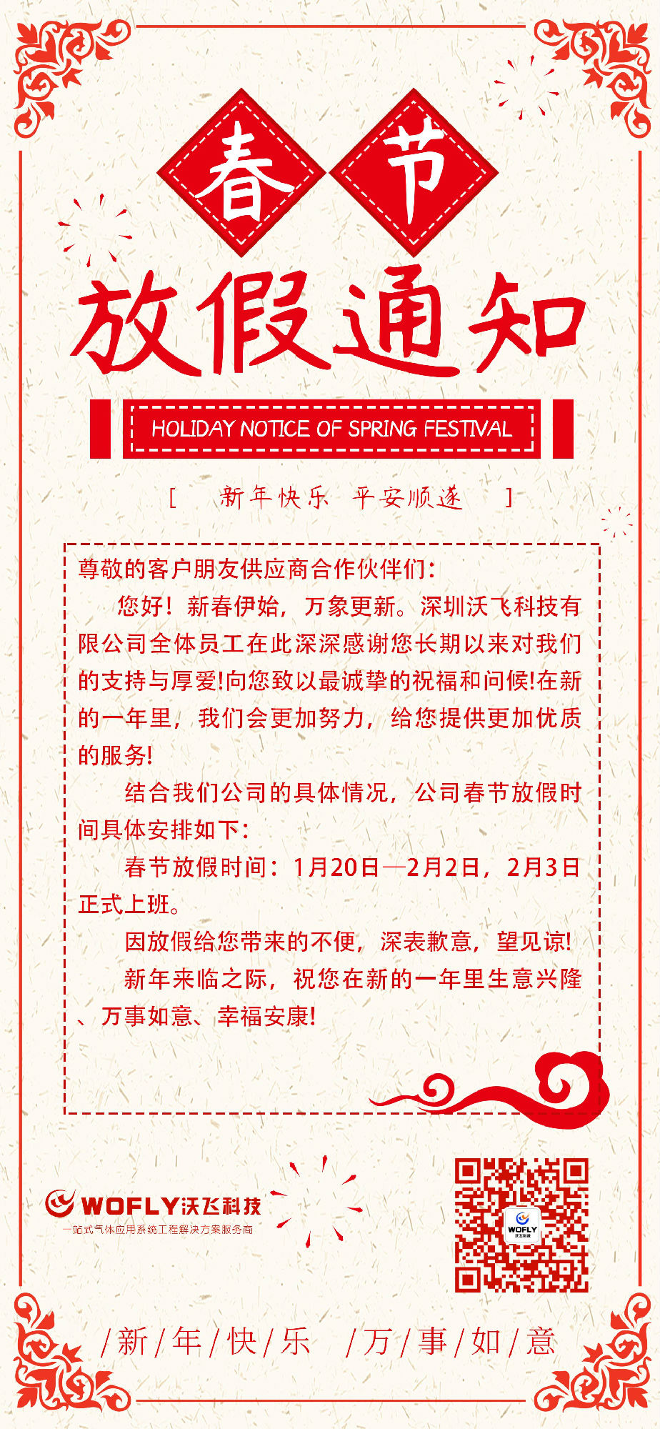 深圳沃飛科技有限公司關(guān)于2020年春節(jié)放假安排通知