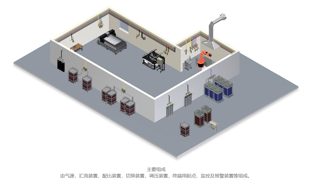 工業(yè)集中供氣系統(tǒng)主要由氣源、管道網(wǎng)絡(luò)、控制閥門和終端用氣設(shè)備組成。氣源可以是制氧機(jī)、空壓機(jī)、氮?dú)獍l(fā)生器等設(shè)備,負(fù)責(zé)產(chǎn)生所需的氣體。這些氣體通過管道網(wǎng)絡(luò)輸送到各個(gè)用氣點(diǎn),控制閥門用于調(diào)節(jié)氣體的流量和壓力,以確保終端用氣設(shè)備能夠得到穩(wěn)定可靠的氣體供應(yīng)。