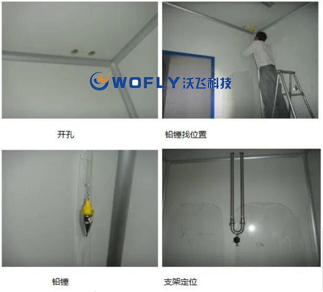 安裝時,先在頂棚打出與管道同尺寸的孔洞,將固強套管固定在孔洞上,然后再將做好的支吊架自下而上的穿過頂棚,按照預設的高度,將支架固定在墻面上。